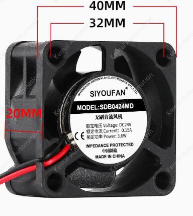 Voltage (VDC): 24VCurrent (A):0.15Power (W):3.6Rotational speed (RPM):9500Noise (dB):34.6Air Flow (CFM):11.3Bearing structure: double balls