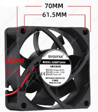 Voltage (VDC): 24VCurrent (A):0.25Power (W):6Rotational speed (RPM):4700Noise (dB):45.5Air Flow (CFM):44.18Bearing structure: double balls