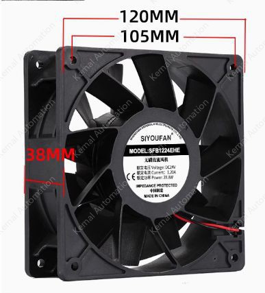 Voltage (VDC): 24VCurrent (A):1.2Power (W):28Rotational speed (RPM):4000Noise (dB):62Air Flow (CFM):185Bearing structure: double balls