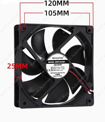 Voltage (VDC): 24VCurrent (A):0.42Power (W):10Rotational speed (RPM):3500Noise (dB):46Air Flow (CFM):115Bearing structure: double balls