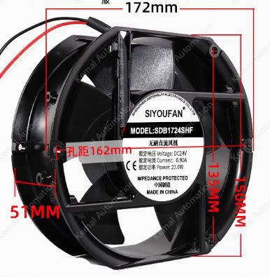 Voltage (VDC): 24VCurrent (A):0.9Power (W):21.6Rotational speed (RPM):3300Noise (dB):60Air Flow (CFM):273Bearing structure: double balls