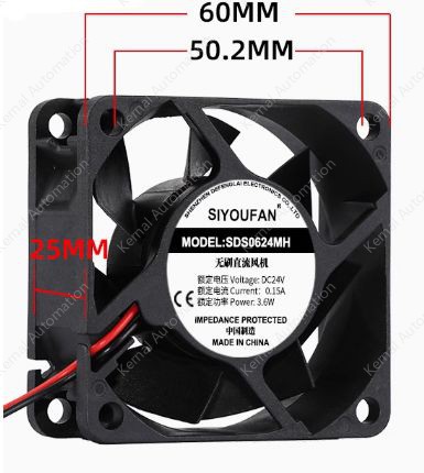 Voltage (VDC): 24VCurrent (A):0.15Power (W):3.6Rotational speed (RPM):3200Noise (dB):18.34Air Flow (CFM):21Bearing structure: oil-impregnated bearing