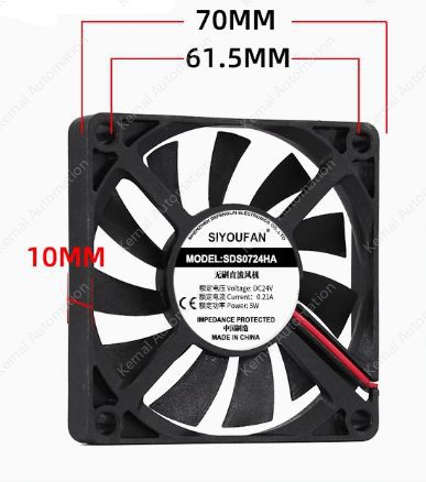 Voltage (VDC): 24VCurrent (A):0.21Power (W):5Rotational speed (RPM):3600Noise (dB):33.5Air Flow (CFM):31.01Bearing structure: oil-impregnated bearing