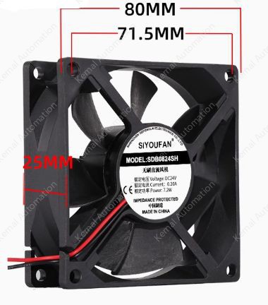Voltage (VDC): 24VCurrent (A):0.3Power (W):7.2Rotational speed (RPM):3800Noise (dB):38Air Flow (CFM):42Bearing structure: oil-impregnated bearing