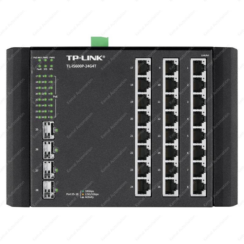 TL-IS600P-24G4T is a Layer 3 managed industrial PoE switch designed for industrial environments by TP-LINK. 24 Gigabit Adaptive Ethernet ports and 4 10 Gigabit SFP+ ports are available.