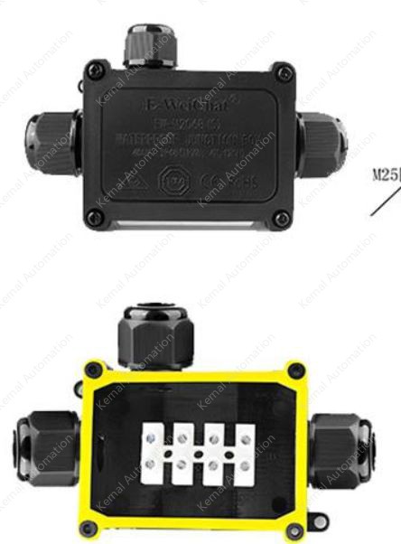 Two-way wire terminal junction box plastic waterproof junction box outdoor court light power supply IP68 waterproof boxApplication Scenario: Lighting ElectronicsDegree of protection: IP68Junction box connector size upper and lower connectors: M20; Left and right connectors: M25CharacteristicsWaterproof, dustproof, flame retardant, UV resistantWaterproof rating: IP68Voltage: 450VCurrent: 40ANumber of lines squared: 0.5-6mm²Outer wire diameter: M25: 5-9mm, 9-12mm, 10-14mmAmbient temperature: -40°C-+105°CWaterproof rating: IP68Housing material: PA66Terminal Material: Copper AlloyNo fear of high temperature nylon shell, no fear of high temperature exposure, safety and no hidden dangersAdditional loss dB: 0.1dBColor: BlackMaterial: PlasticWiring: 1 in and 2 out