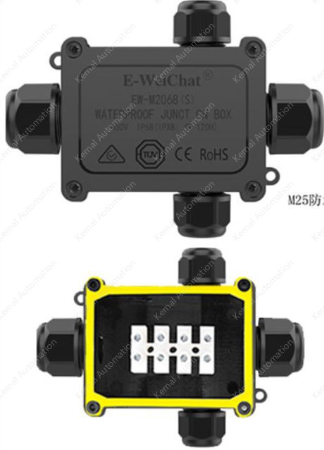 Two-way wire terminal junction box plastic waterproof junction box outdoor court light power supply IP68 waterproof boxApplication Scenario: Lighting ElectronicsDegree of protection: IP68Junction box connector size upper and lower connectors: M20; Left and right connectors: M25CharacteristicsWaterproof, dustproof, flame retardant, UV resistantWaterproof rating: IP68Voltage: 450VCurrent: 40ANumber of lines squared: 0.5-6mm²Outer wire diameter: M25: 5-9mm, 9-12mm, 10-14mmAmbient temperature: -40°C-+105°CWaterproof rating: IP68Housing material: PA66Terminal Material: Copper AlloyNo fear of high temperature nylon shell, no fear of high temperature exposure, safety and no hidden dangersAdditional loss dB: 0.1dBColor: BlackMaterial: PlasticWiring: 2 in and 2 out