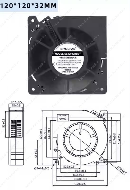 Voltage:AC110V~240VFrequency:50/60HZPower:7WSpeed:3000+10%RPMWind pressure:36.15mmHz0Air Flow:28.5CFMNoise:45dB(A)Bearing type: double ball