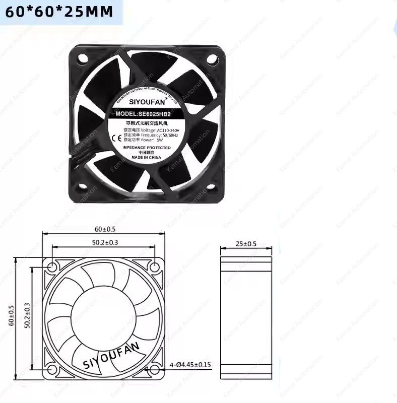Voltage: AC110V~240VFrequency: 50/60HZPower: 5WSpeed: 4600+10%RPMWind pressure: 4.55mmHz0Airflow: 25.05CFMNoise: 39dB(A)Bearing type: double ball