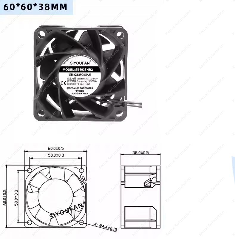 Voltage: AC110V~240VFrequency: 50/60HzPower: 10WSpeed: 9000+10%RPMWind pressure: 36mmHz0Air Flow: 52.5CFMNoise: 52dB(A)Bearing type: double ball