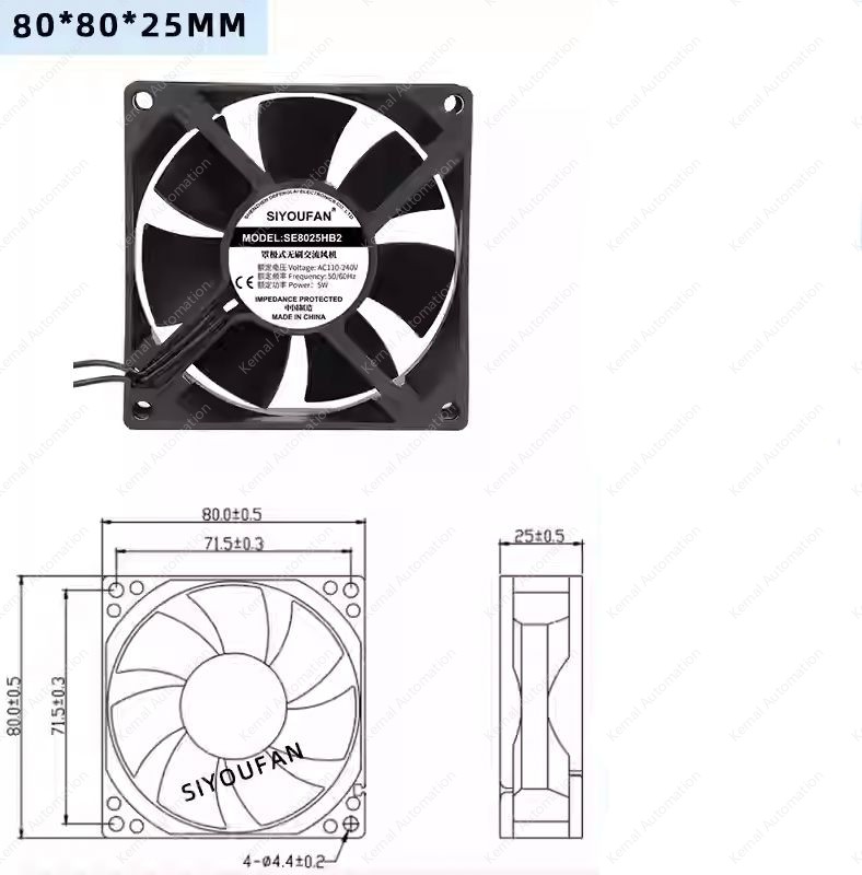 Voltage: AC110V~240VFrequency: 50/60HzPower: 5WSpeed: 4000+10%RPMWind pressure: 4.57mmH20Airflow: 40.2CFMNoise: 34dB(A)Bearing type: double ball